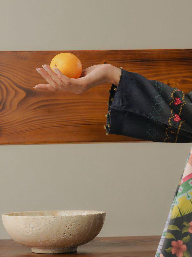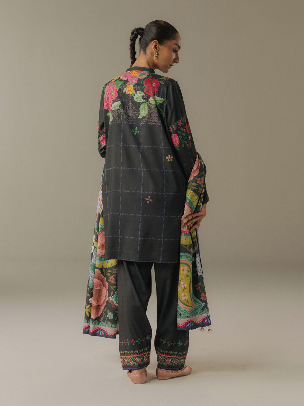 • DESCRIPTION: A charcoal shirt inspired by traditional cross-stitch embroidery, paired with matching charcoal trousers for a sleek and cohesive look. The ensemble is brought to life with a bold, colorful paisley shawl that adds vibrance, artistry, and a striking contrast to the deep tones of the outfit.