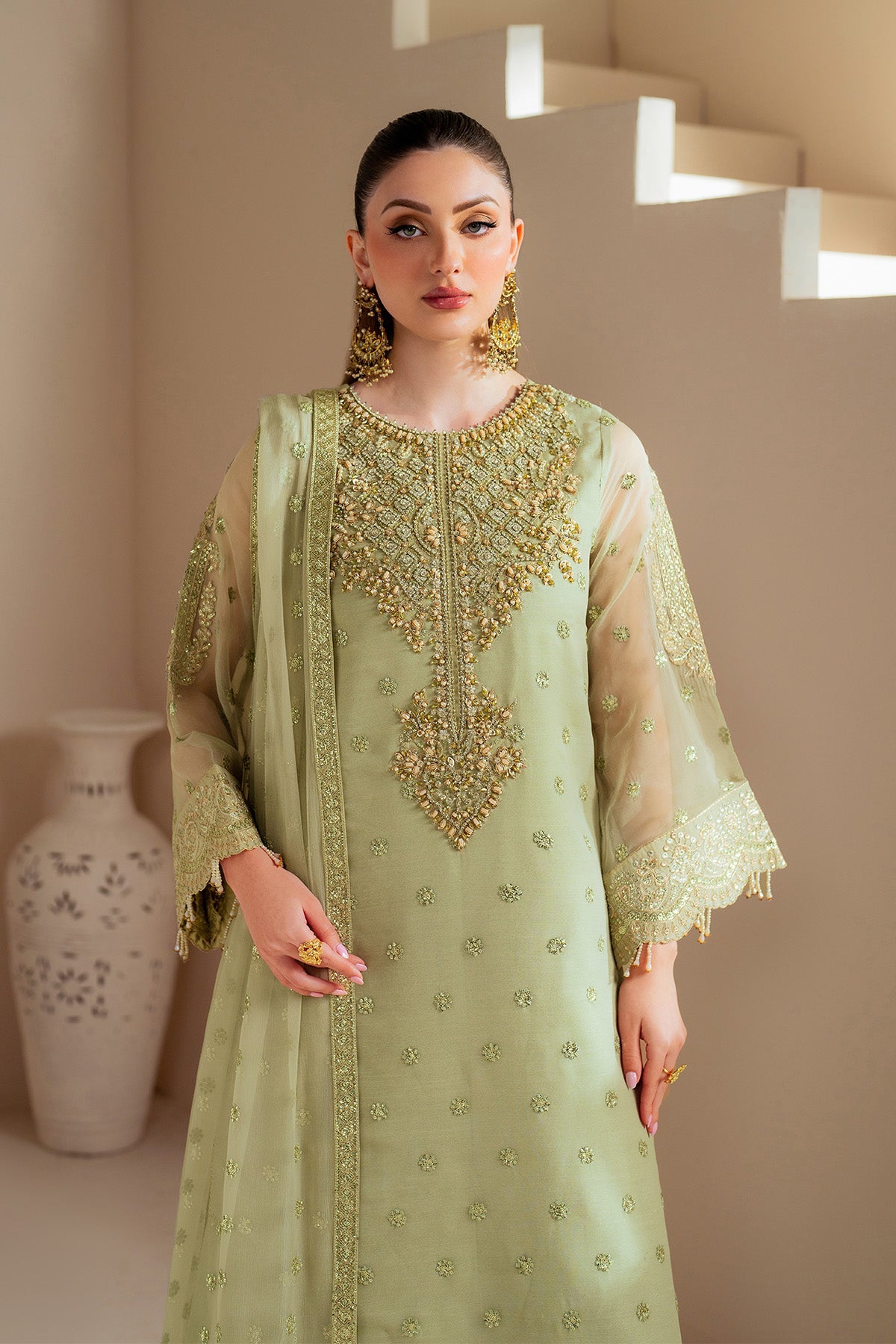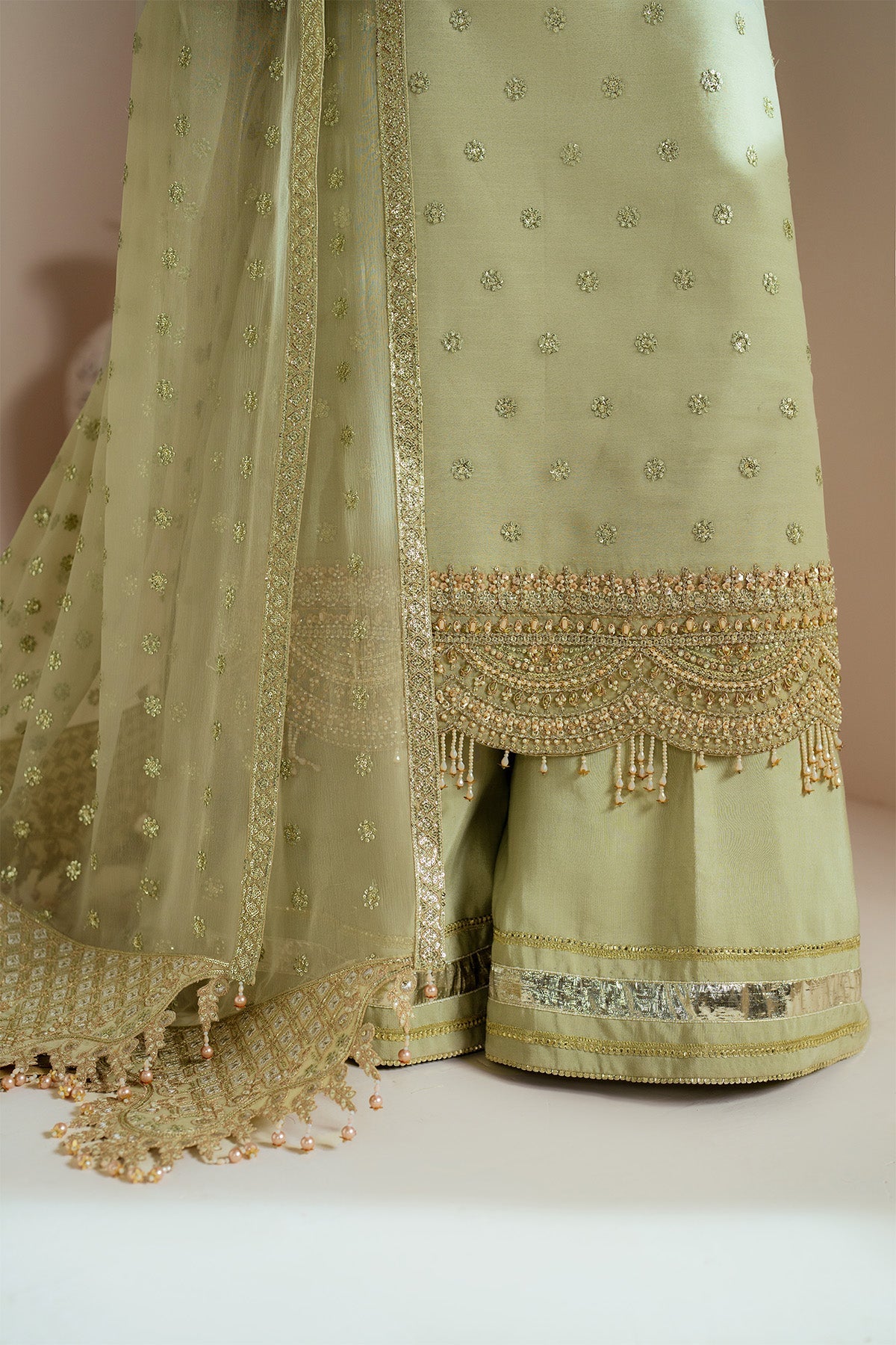• DESCRIPTION: The "Alish" ensemble showcases a stunning mint green shirt, lavishly embroidered and expertly crafted from soft bamber chiffon. Intricate hand embellishments, including beads, pearls, and sequins, enhance its delicate design. The neckline, adorned with heavy embroidery, and the exquisitely designed sleeves add to the opulence of the piece. Completing the look is a flowing chiffon dupatta and raw silk trousers, imparting an ethereal and enchanting touch to this festive ensemble.