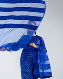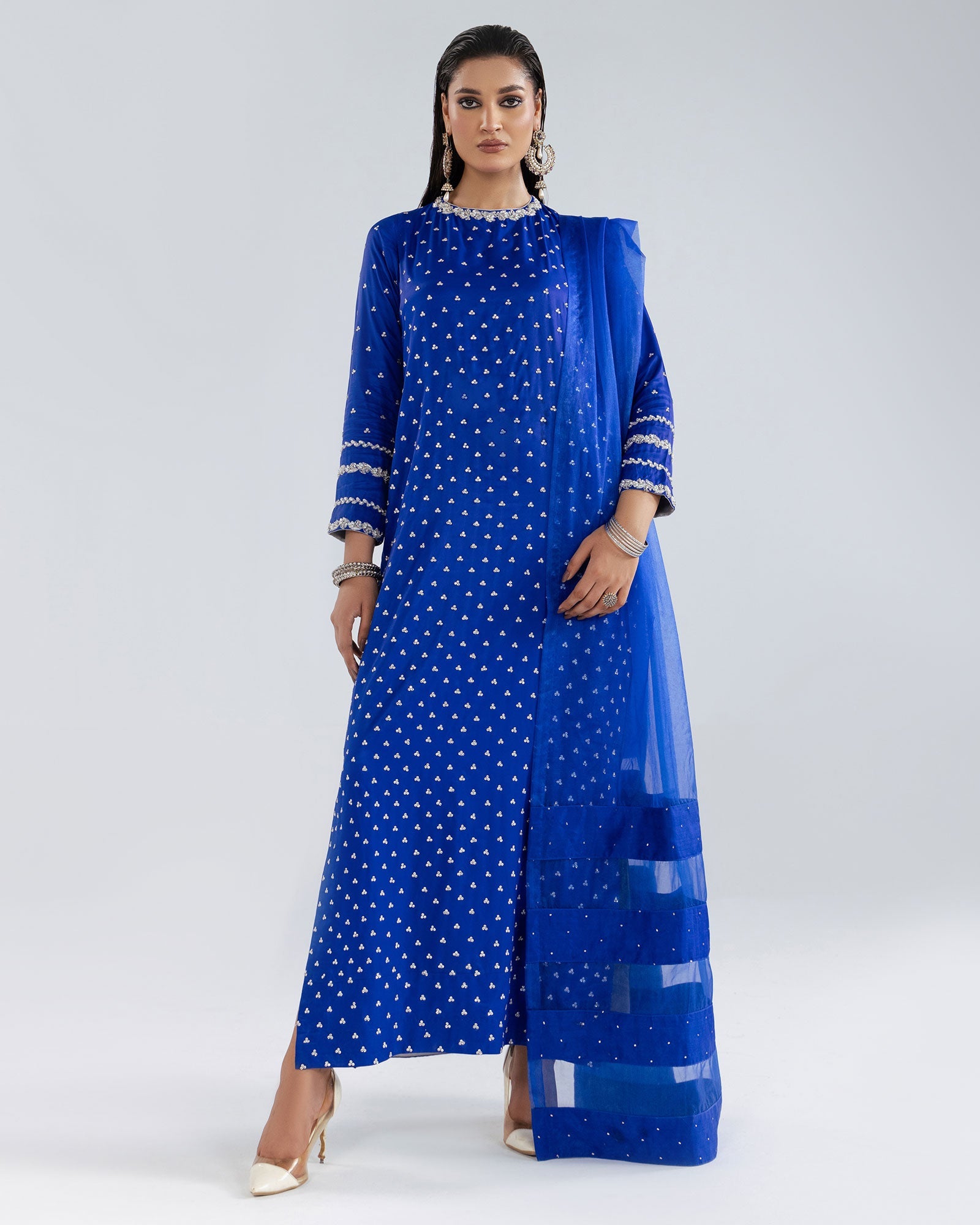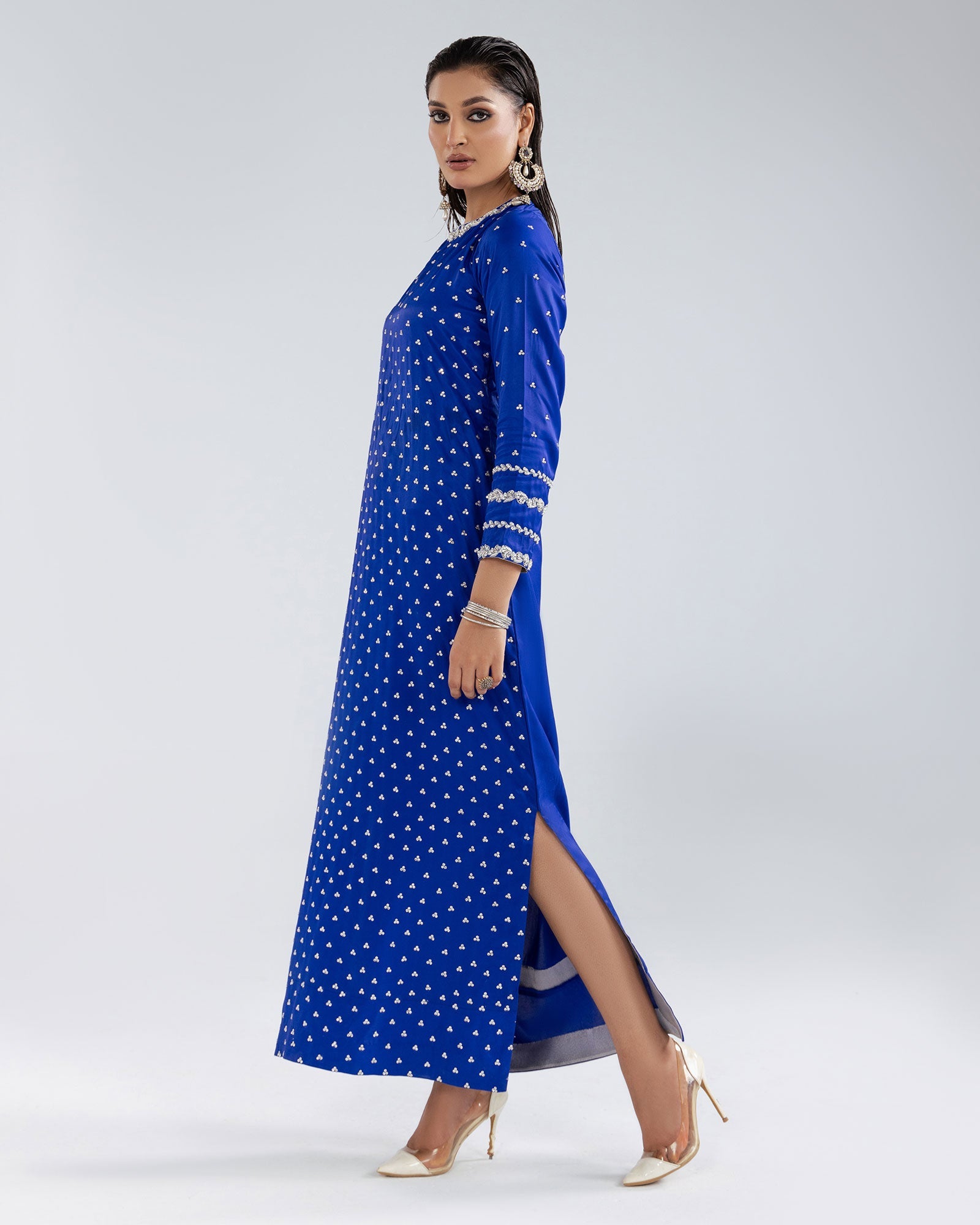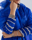 - Moroccan blue look, the straight cotton silk maxi dress, Hand embellished with shining crystals and sequins all over the shirt, and the neckline. It is designed in a slim silhouette with a bold side slit. It includes a matching embellished dupatta.