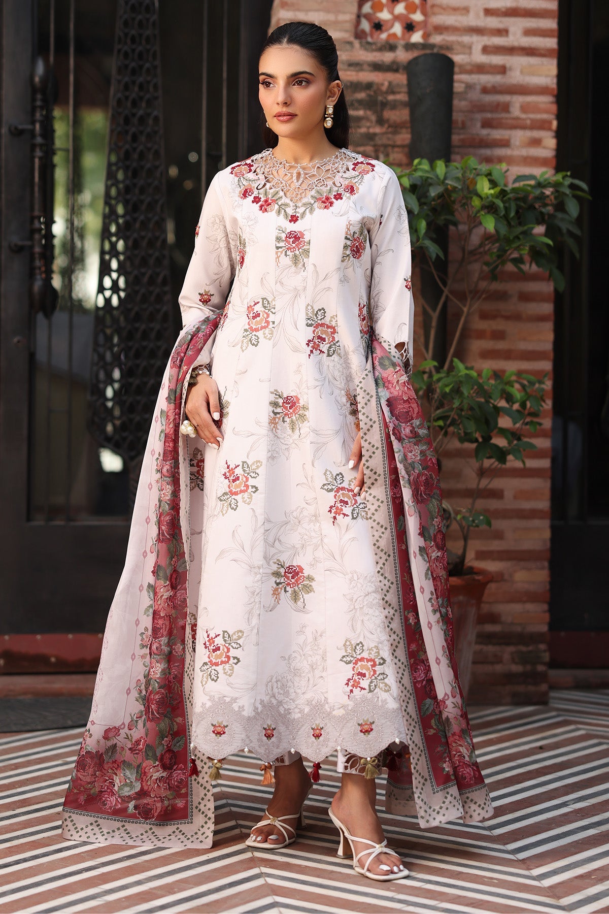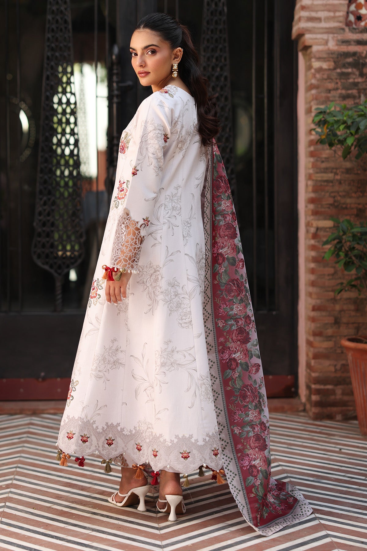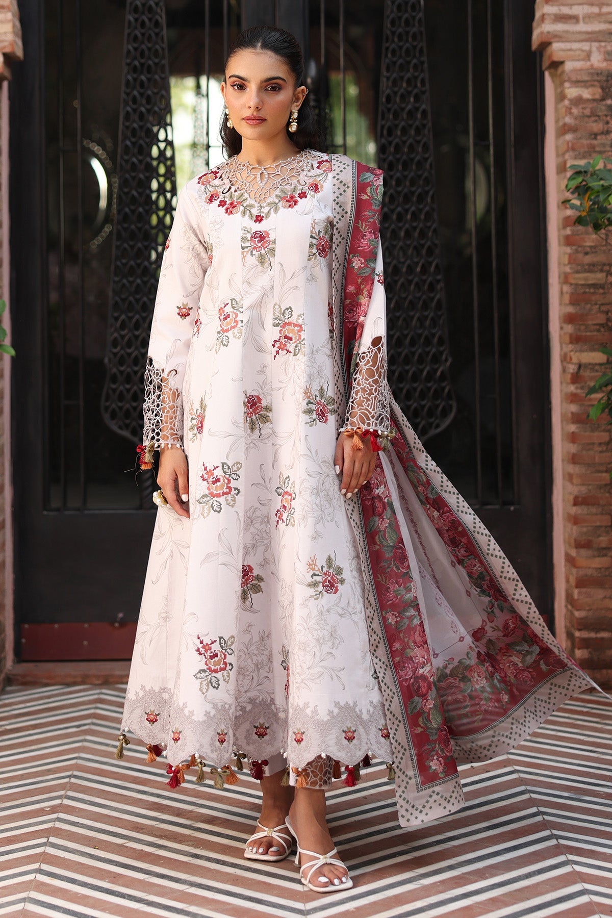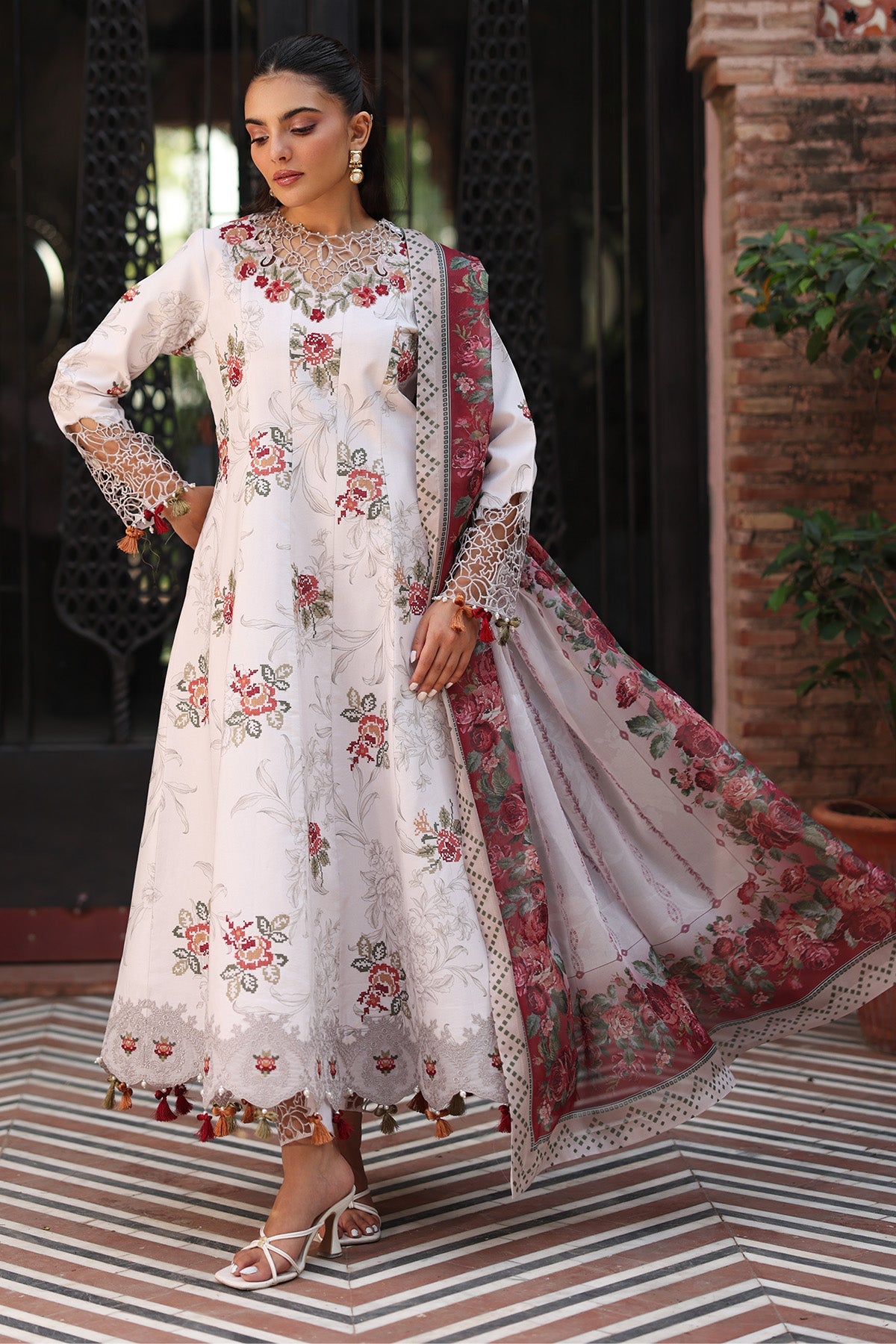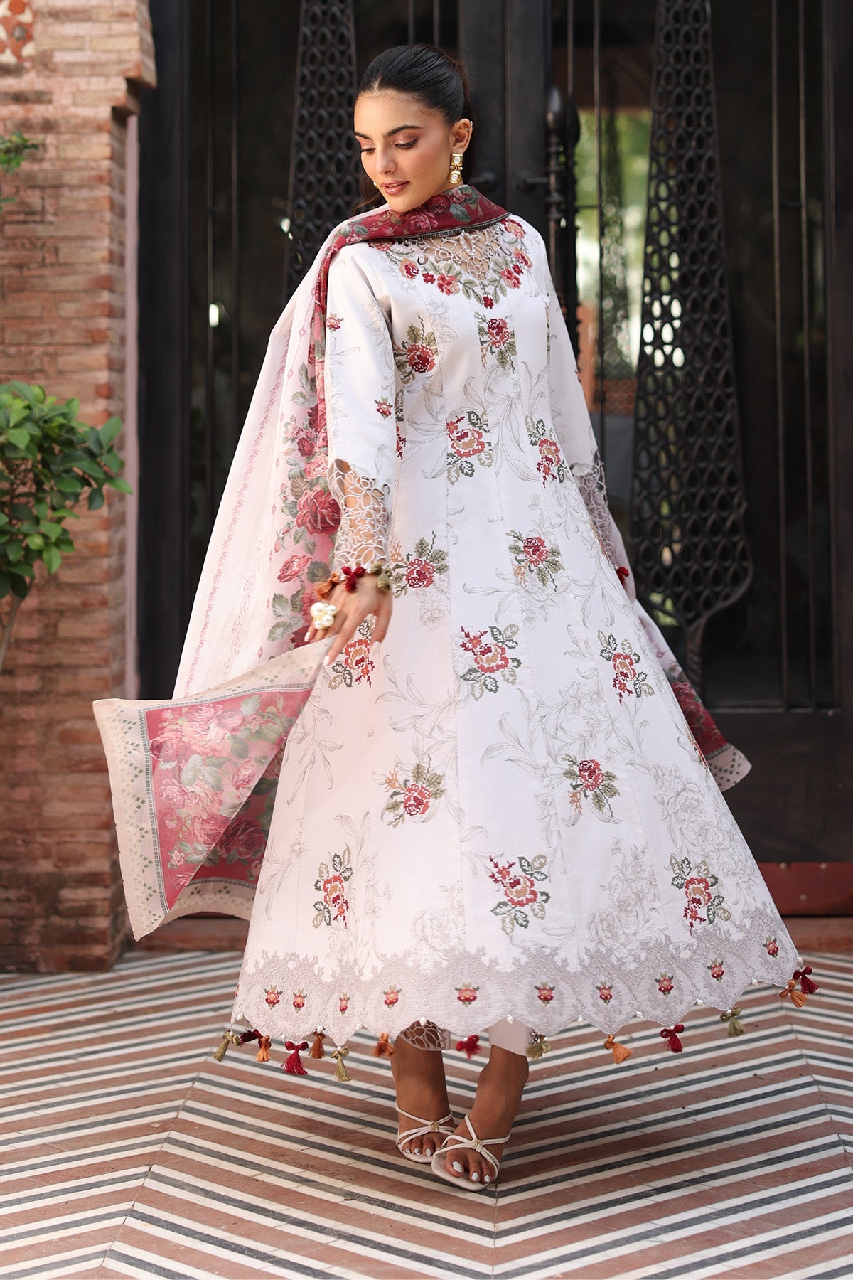 • DESCRIPTION: Draped in classic white, “Kunar” is crafted to captivate. The floral-printed lawn maxi radiates elegance, enhanced by delicate cutwork along the neckline. Paired with a strikingly contrasted digitally printed silk dupatta and cotton trousers, this ensemble is the perfect blend of sophistication and allure—ideal for any occasion.